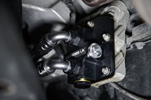 If you have already taken the precaution to upgrade to the Mishimoto Oil Cooler Kit but want to enhance this further by removing the factory style sandwich plate, this can be done without purchasing a complete new kit. Our Nemesis UK kit provides a Thermostatic Take Off plate in place of the original RHD Oil Cooler position behind the steering rack, replacing the blanking plate and eliminating the thermostatic oil filter sandwich plate. With the best quality Aeroquip Nomex Nylon Braided Hose and Aeroquip & Setrab Fittings this will connect straight up to the front mounted oil cooler matrix core.