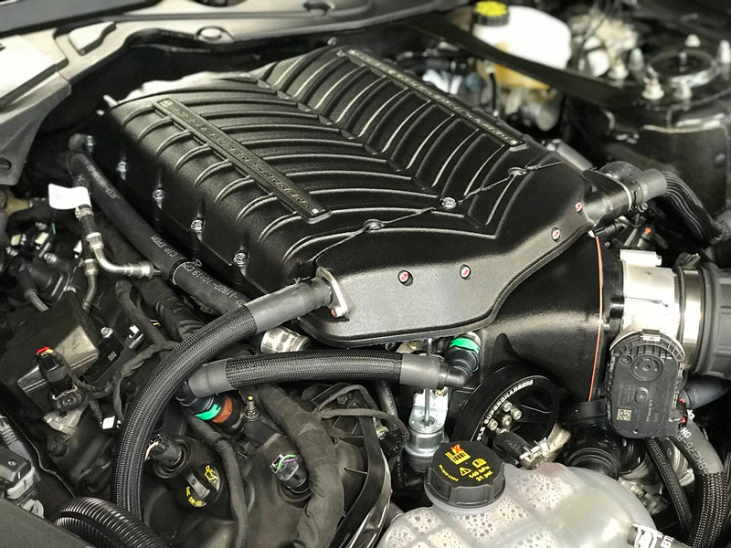 The Whipple Supercharger Stage 1 SC system features the high flowing Bosch 55 lb/hr fuel injectors from the 13-14 GT500. These EV6 mid length fuel injectors offer dual offset angle spray pattern to allow for excellent idle, cold start and drive-ability, yet enough capacity for the massive power gains. Each system comes with extruded, 6AN billet fuel rails with 1/8" NPT port for fuel psi checking or gauges. No other fuel system modifications are required. *Vehicles with 75k mileage should replace the fuel pump and fuel filter due to deterioration. The DW415 fuel pump is a direct replacement and increases significant increase in flow capacity.